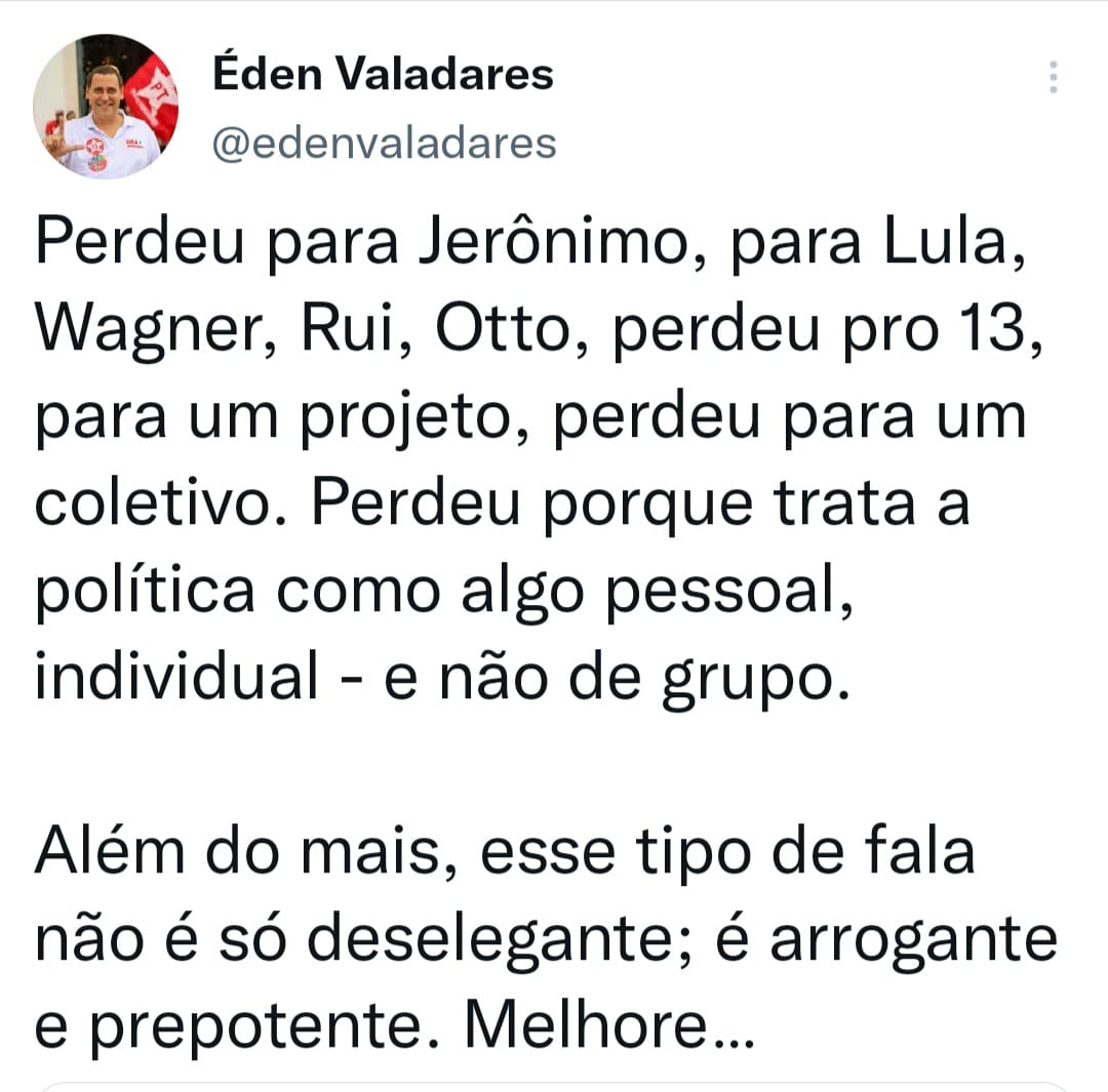 Éden criticou ainda o tom da declaração de ACM Neto, classificando-a como “arrogante e prepotente”. “Além do mais, esse tipo de fala não é só deselegante; é arrogante e prepotente. Melhore”, finalizou o dirigente estadual.