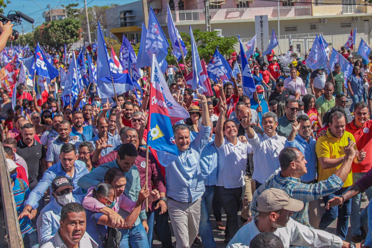 O governador Rui Costa, o senador Jaques Wagner e os pré-candidatos a vice-governador, Geraldo Júnior (MDB), e a senador, Otto Alencar (PSD), participaram do evento deste domingo, que levou mais de 8 mil pessoas ao espaço Mega Show Predileto. Os eventos em Jequié, na sexta à noite, e em Itaberaba, no sábado, atraíram mais de 10 mil militantes e apoiadores do time de Lula na Bahia.