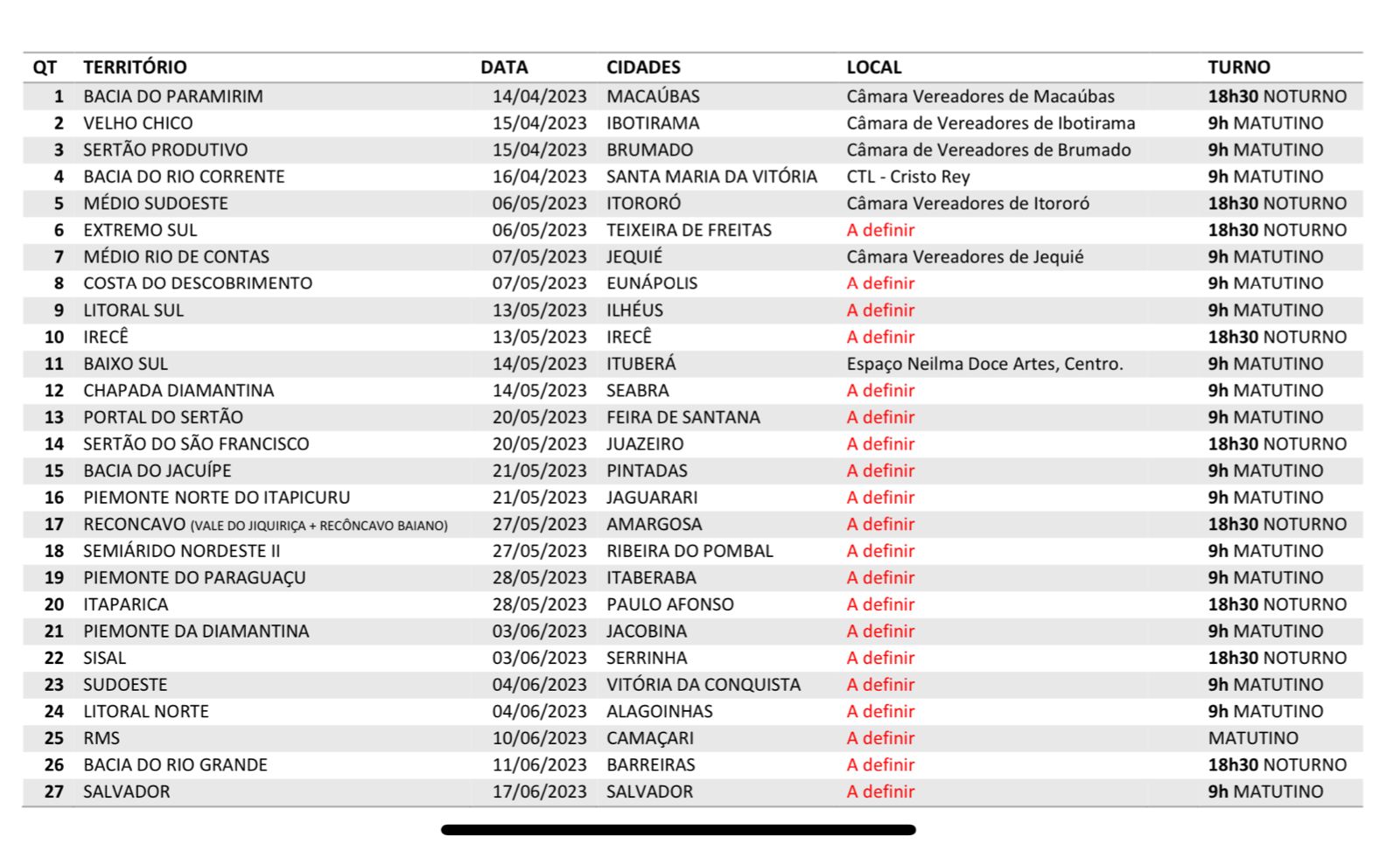 A Executiva Estadual Partido dos Trabalhadores da Bahia em diálogo com os diretórios municipais adequou um novo calendário para os Encontros Territoriais, que foram iniciados neste mês em Macaúbas (Bacia do Paramirim), Ibotirama (Velho Chico) e em Brumado (Sertão Produtivo). Com a atualização, as mobilizações serão realizadas até junho em todos os Territórios de Identidade do Estado, percorrendo quase 30 cidades, para organizar e fortalecer o partido em toda a Bahia.