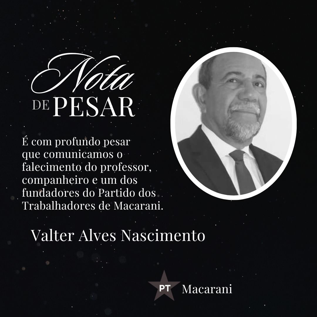 O Partido dos Trabalhadores da Bahia recebeu com grande tristeza a notícia do falecimento do professor, companheiro e um dos fundadores do PT do município de Macarani, Dr. Valter Alves Nascimento, que ocorreu em Salvador nesta quarta-feira, 24.
