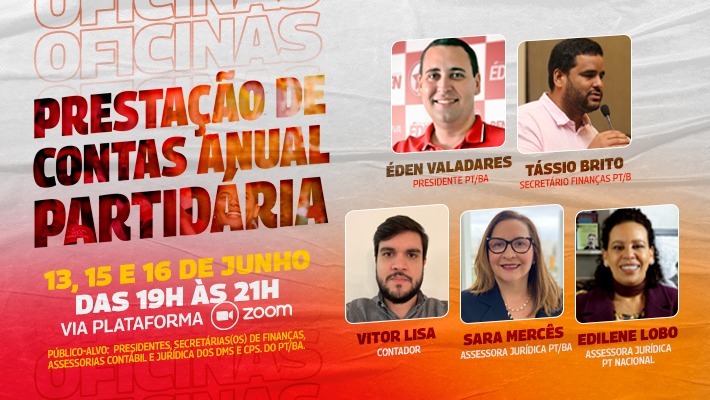 O Partido dos Trabalhadores da Bahia promoverá oficinas de prestação de contas anual partidária nos dias 13, 15 e 16 de junho, das 19 às 21 horas, para presidentes, secretários e secretárias de Finanças, Assessorias Contábil e Jurídica dos Diretórios Municipais e das Comissões Provisórias do PT Bahia, de forma virtual, por meio da plataforma Zoom.