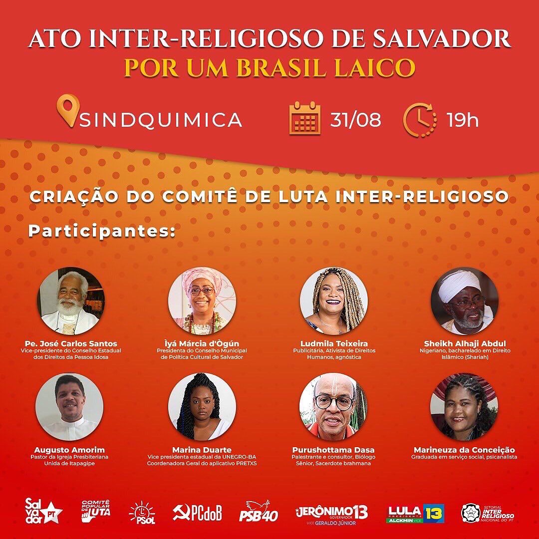 Em defesa da laicidade, da cultura da paz e de um Brasil que respeite a diversidade, o PT inaugura nesta quarta-feira (31), com um ato programado para as 19h, no Sindquímica (Tororó), o Comitê de Luta Inter-religioso de Salvador. O evento contará com a presença do coordenador nacional do Setorial Inter-religioso do PT, Gutierres Barbosa, e do ex-prefeito de Ibotirama e primeiro suplente de Otto Alencar ao Senado, Terence Lessa, assim como de lideranças da igreja católica (padre José Carlos Santos) e do candomblé (Mãe Marcia d´Ogun), presbiterianos, islâmicos, evangélicos, ativistas dos direitos humanos, movimentos sociais e partidos políticos de esquerda.